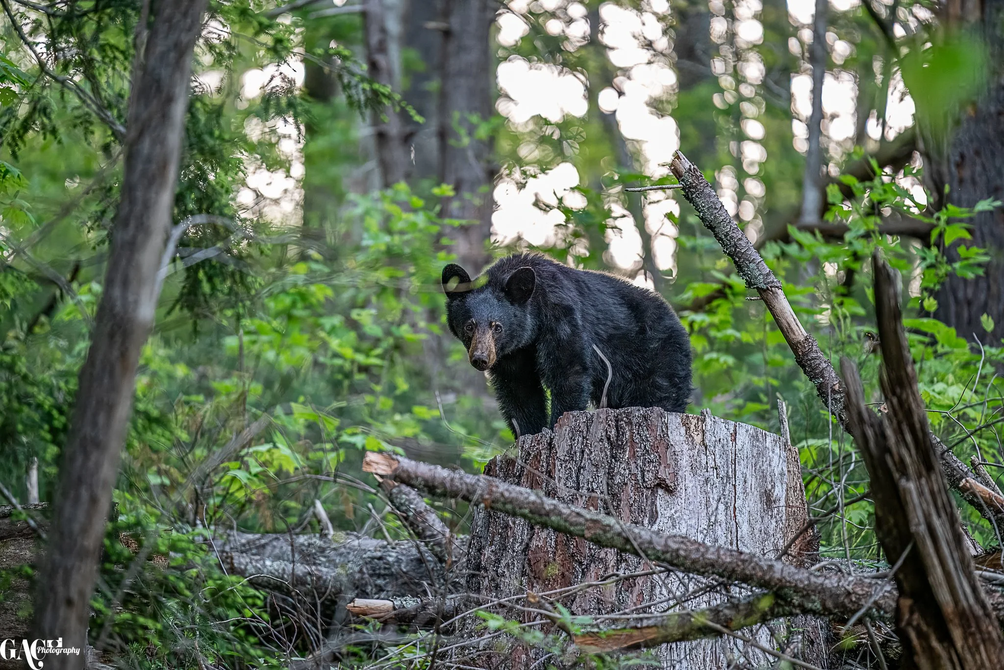 A black bear standing on a tree stump in a forest
