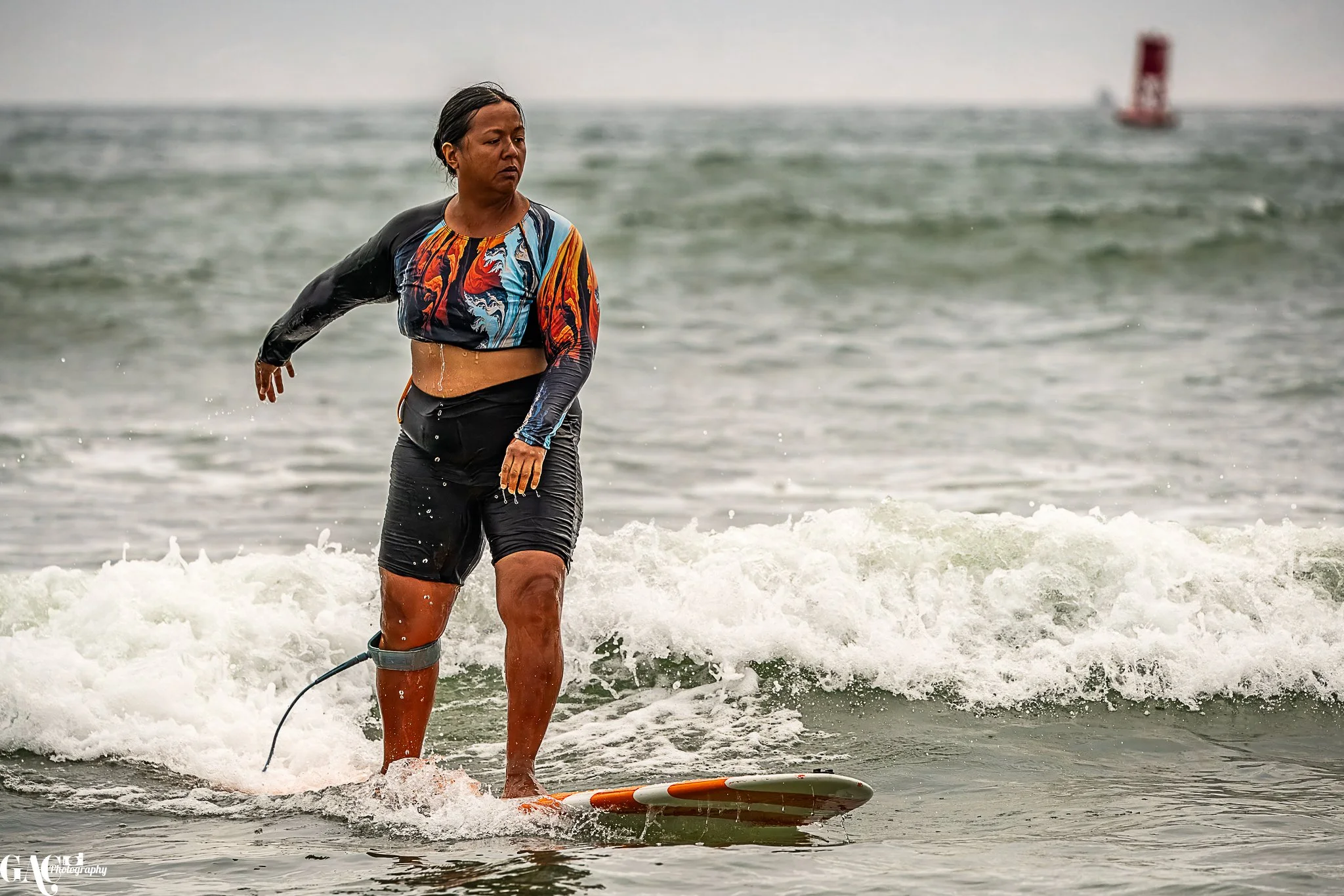 A woman with wet hair in a colorful long-sleeve crop top and black shorts standing on a surfboard in the water, with a distressed expression, near a breaking wave. A ship is visible in the distant background.
