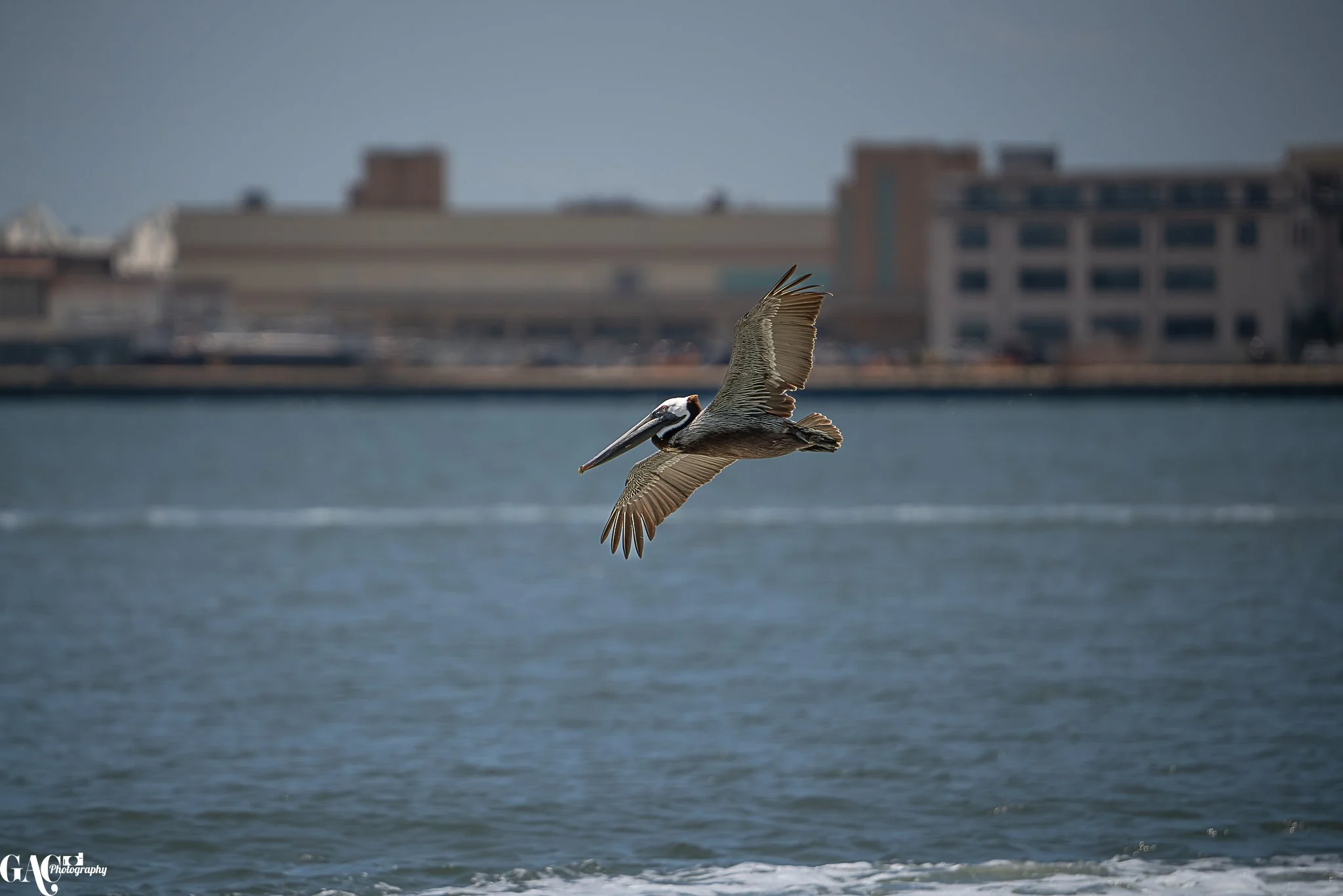 A pelican flying over water with buildings in the background, under a cloudy sky.