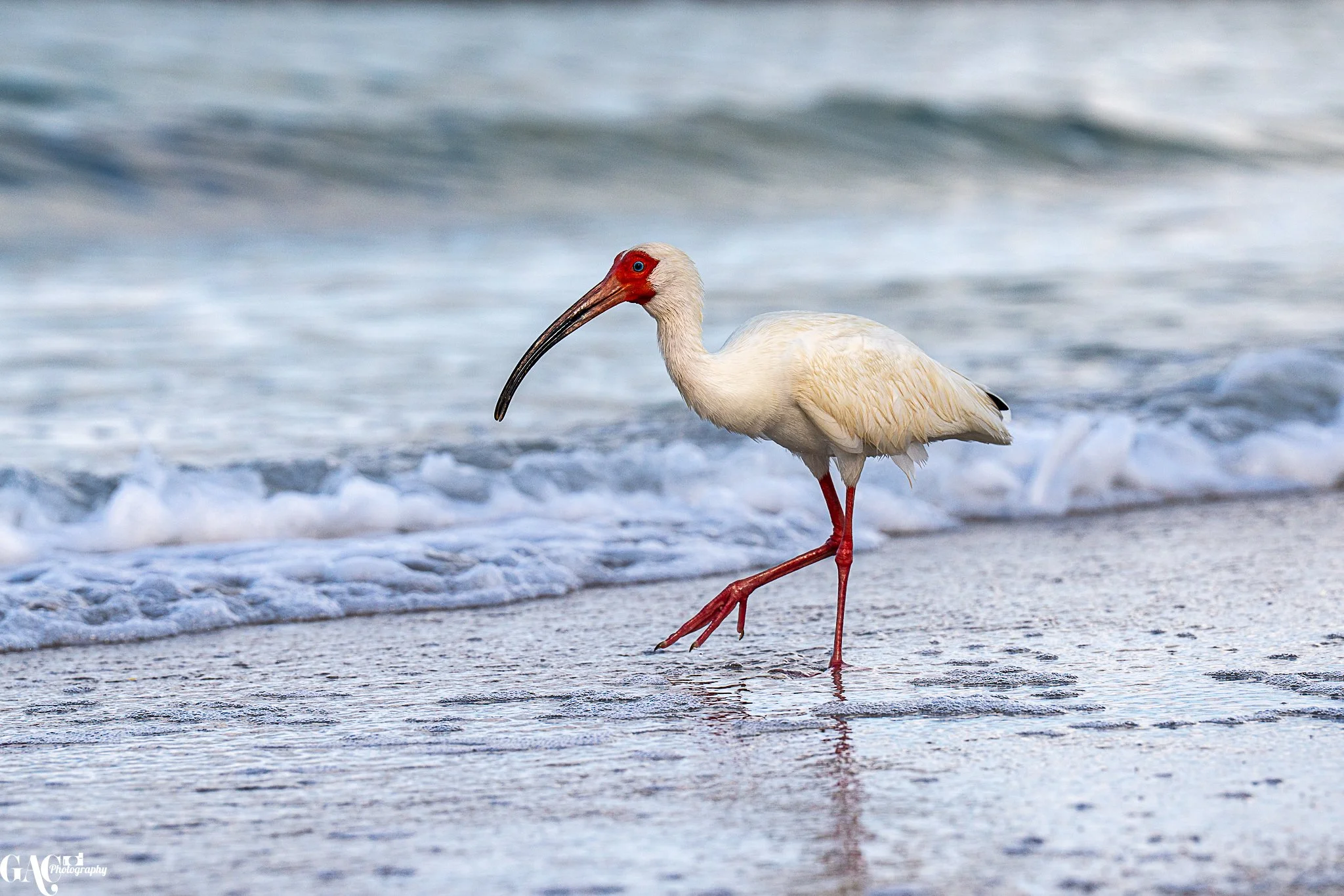 A white ibis with a red face and long, curved bill walking along a shoreline with gentle waves.