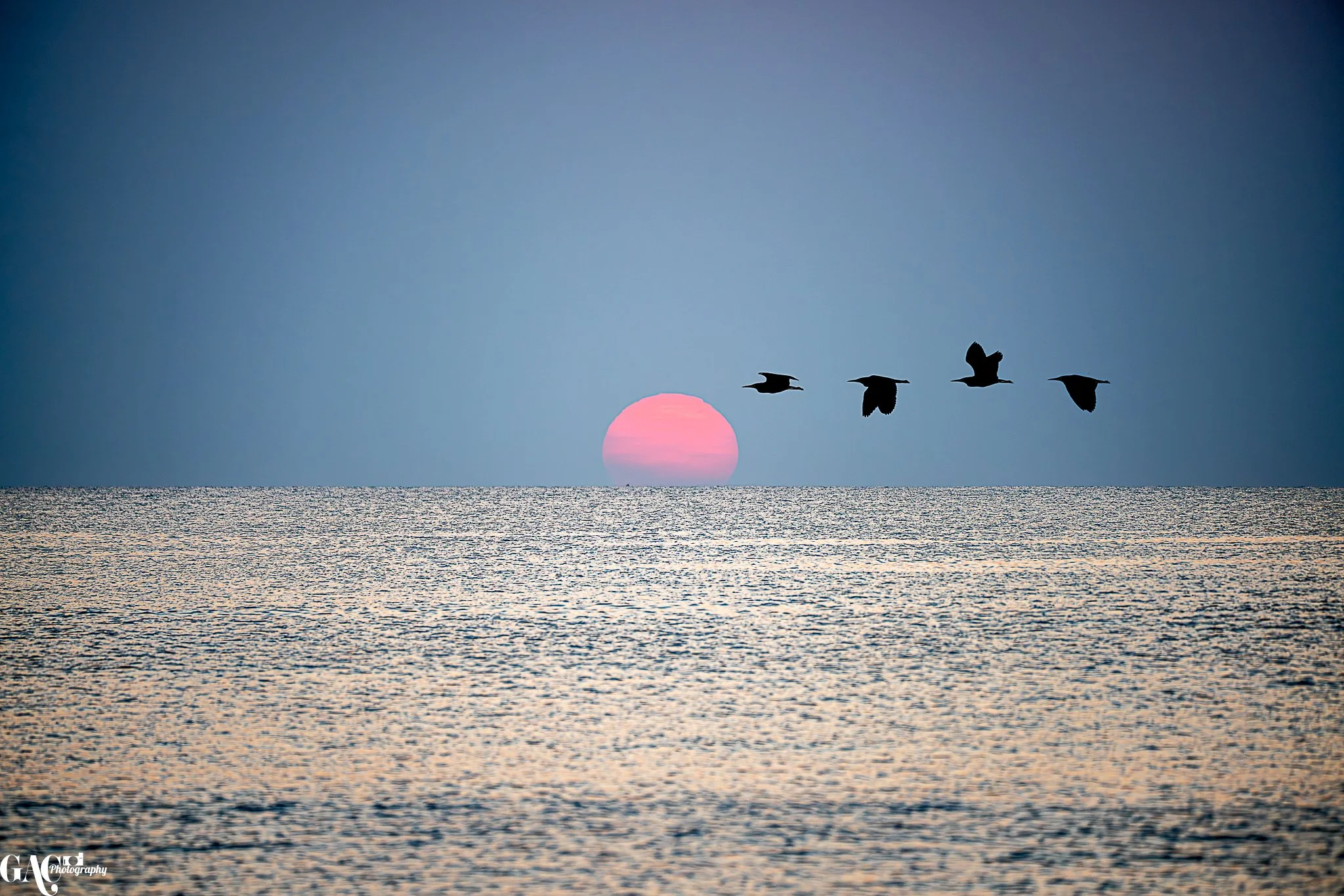 Silhouettes of five birds flying over the ocean at sunset, with a pink sun on the horizon and a blue sky.
