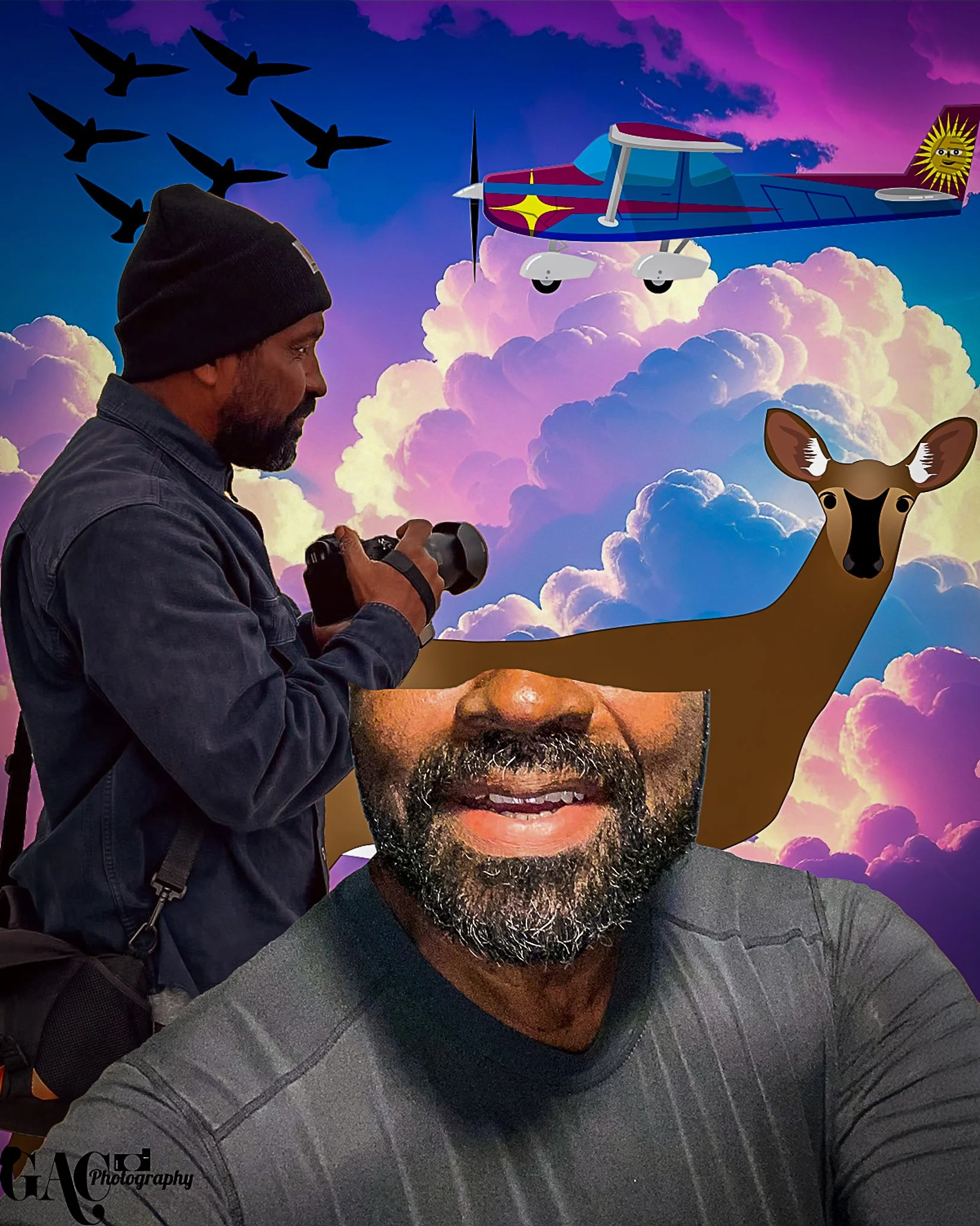 Vision Board Concept. A man with a beard takes a selfie in front of a colorful sky background with clouds, birds, a stylized airplane, a deer head, and a large photo of a man's face.