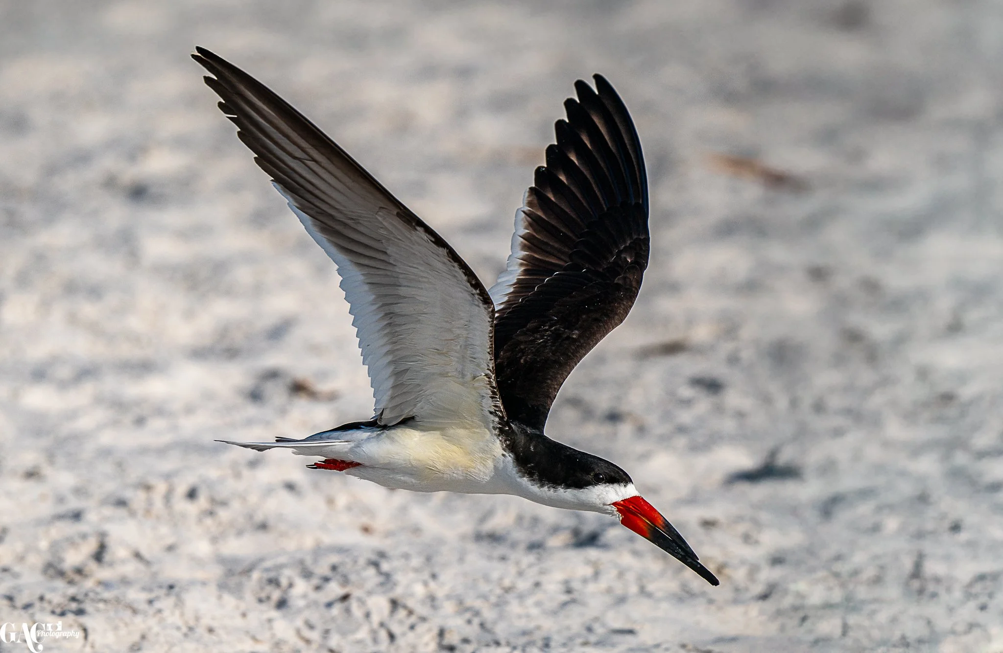 Black skimmer bird flying low over sandy beach with wings spread wide.