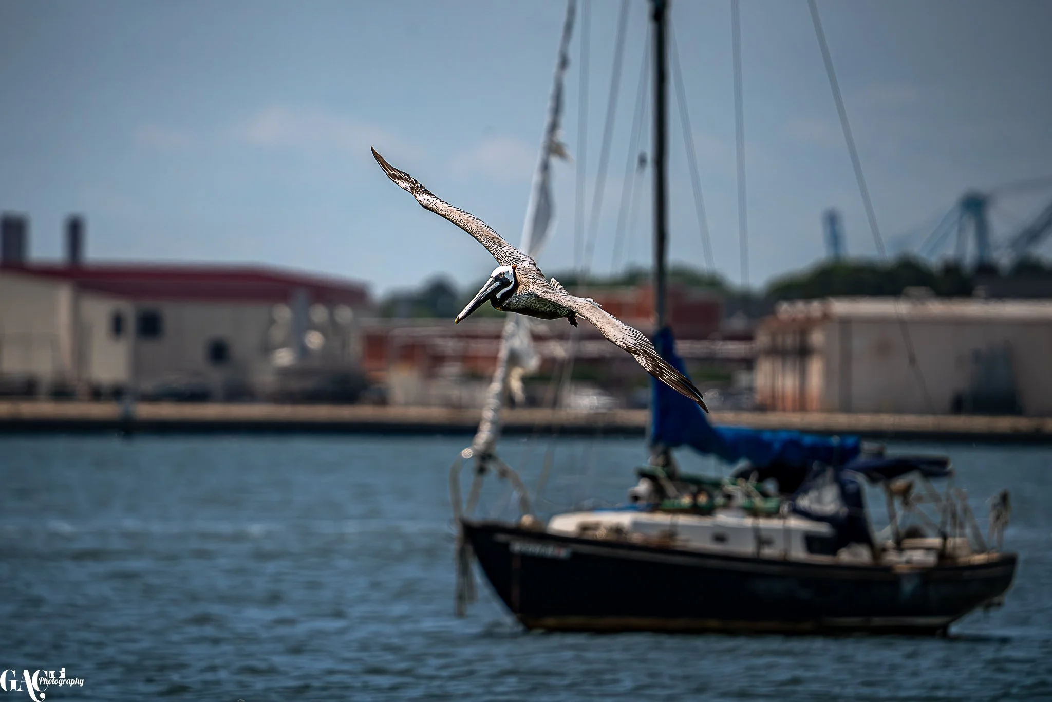 Pelican flying over a sailboat on a body of water with buildings and a crane in the background.