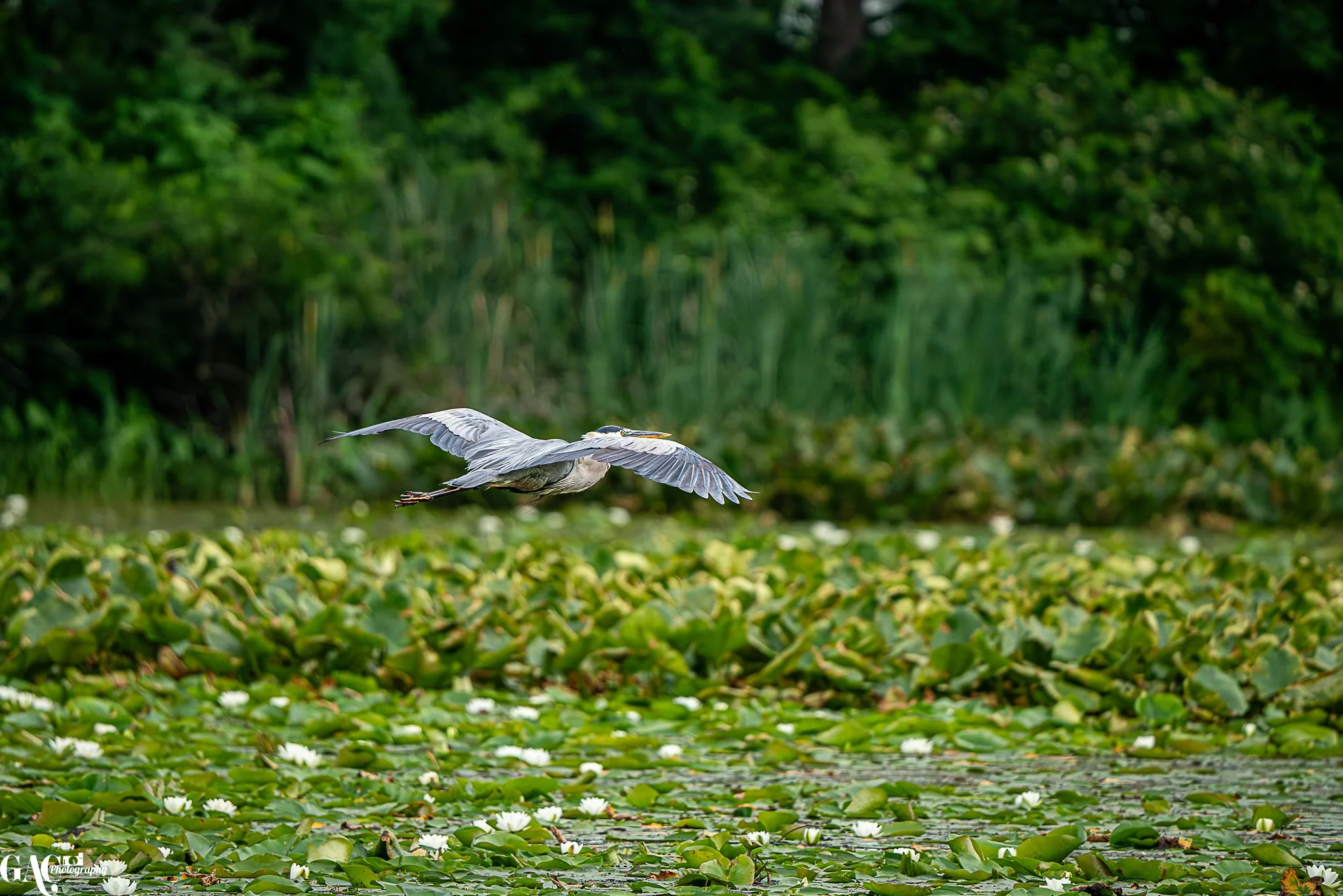 A heron flying low over a pond filled with green lily pads and white water lilies, with a dense green forest in the background.