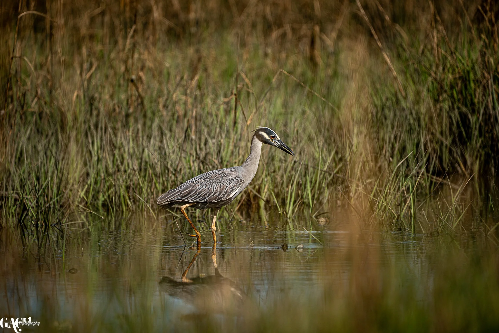 A heron standing in shallow water amidst tall grass and reeds.
