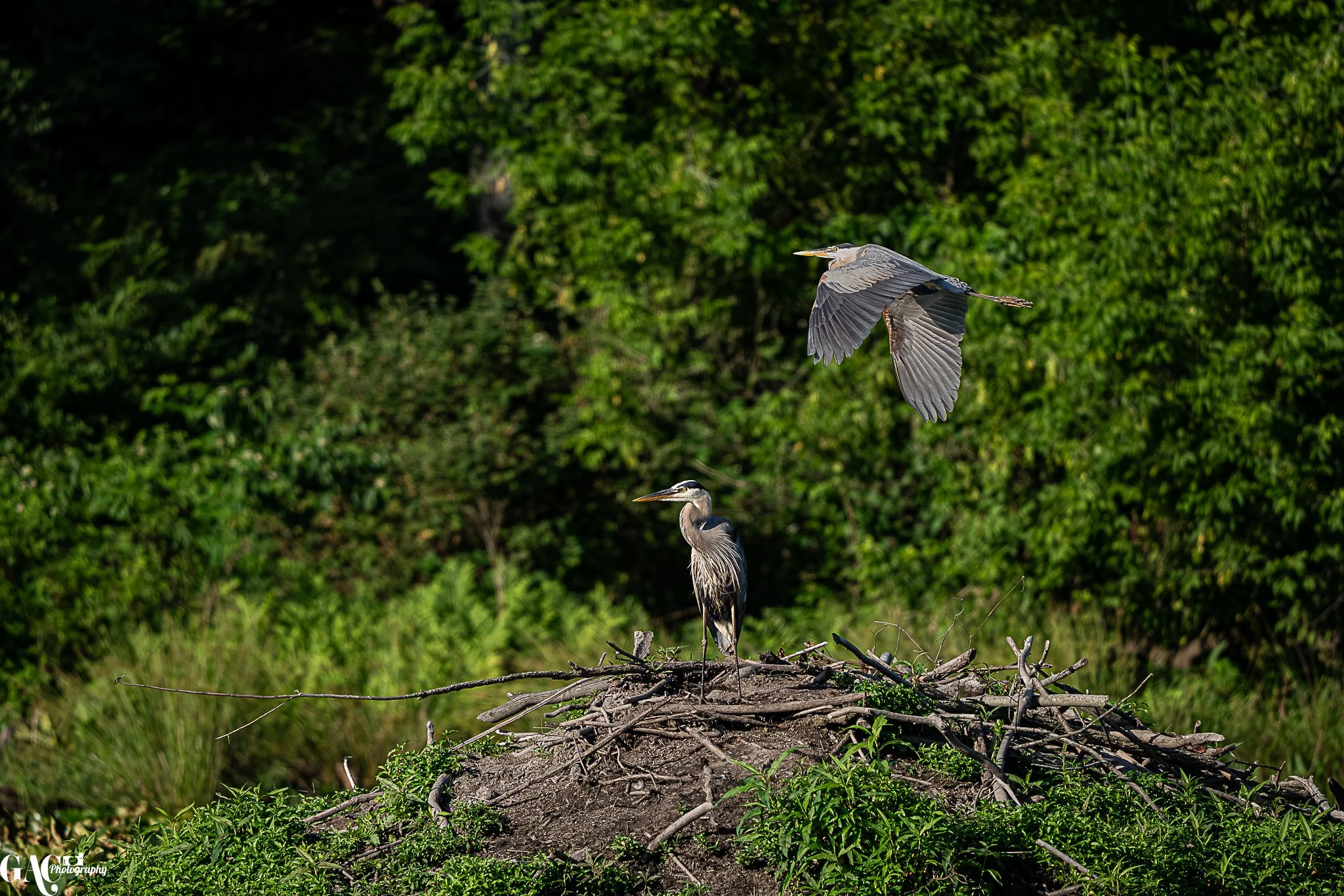A heron standing on a nest made of sticks, with another heron in flight nearby, against a backdrop of lush green trees.